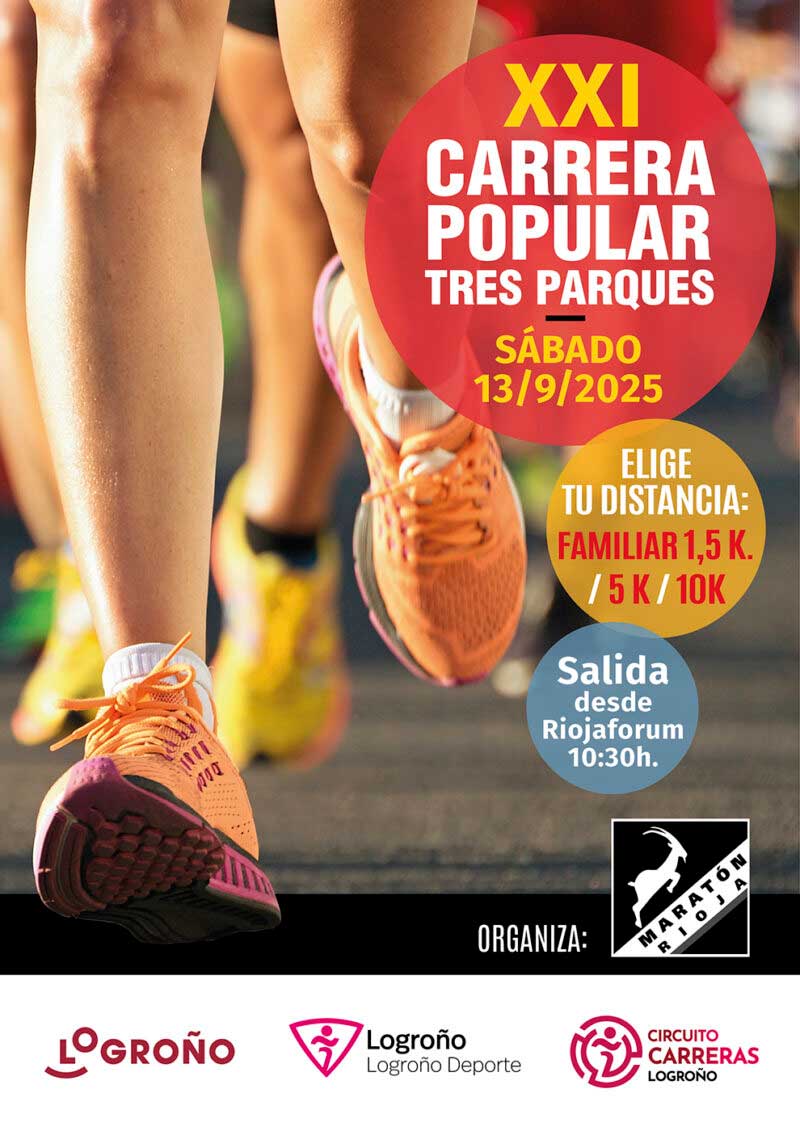 Un año más, Logroño acogerá la XXI Carrera popular Tres Parques, una de las pruebas más populares del atletismo local. Como principal novedad, la edición de este año recuperará el trazado original que recorre los parques del Iregua, La Ribera y el Ebro.