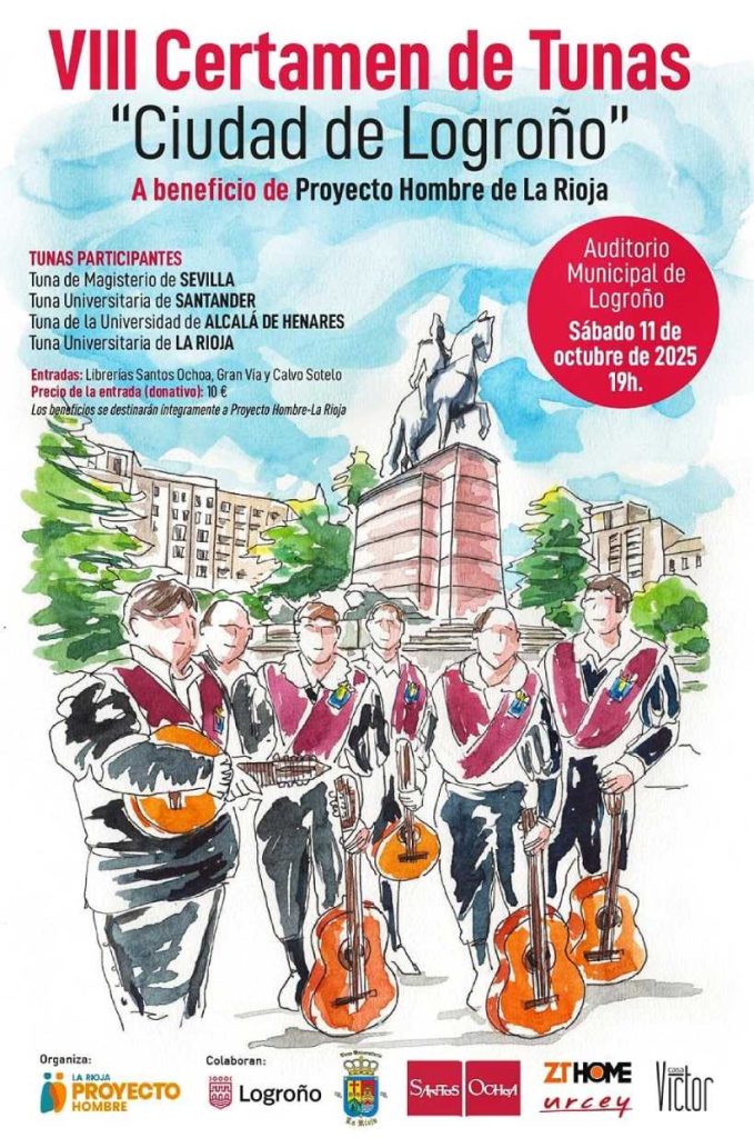 El Auditorio Municipal del Ayuntamiento de Logroño acogerá el VIII Certamen de Tunas “Ciudad de Logroño”, un encuentro que une música y solidaridad. La cita tiene como fin recaudar fondos a beneficio de Proyecto Hombre La Rioja.