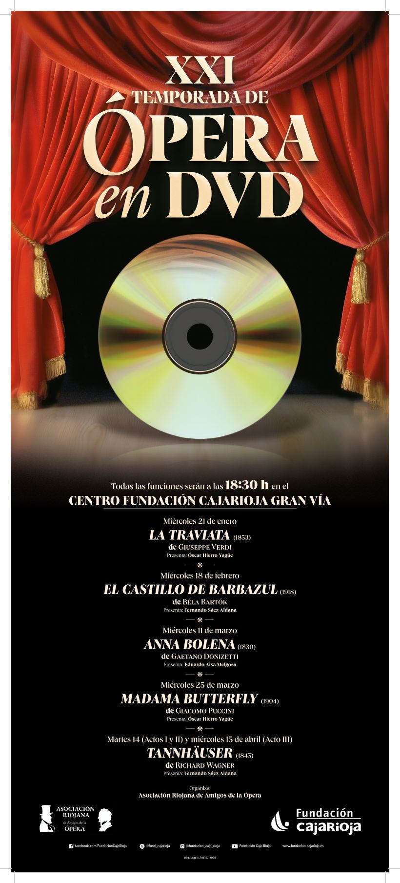 Fundación Caja Rioja y la Asociación Riojana de Amigos de la Ópera retoman este mes de enero una nueva edición del Ciclo de Ópera en DVD, una iniciativa cultural consolidada que suma ya veintiún años acercando la ópera al público general en Logroño.