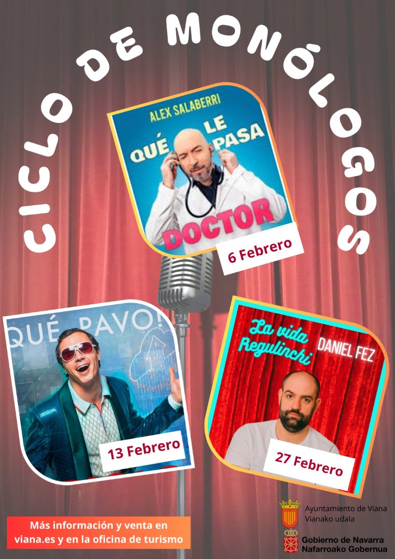 El Ciclo de humor en Viana arranca el 6 de febrero con Qué le pasa doctor, con el médico de profesión y humorista de vocación Alex Salaberri; continúa el 13 de febrero con Fabiolo Connection, de Rafa Maza y su irreverente personaje Fabiolo, el pijo más famoso de la comedia contemporánea; y se cierra el 27 de febrero con La vida regulinchi, de Daniel Fez, uno de los creadores de contenido más seguidos del momento, con un espectáculo cercano, fresco y muy interactivo.