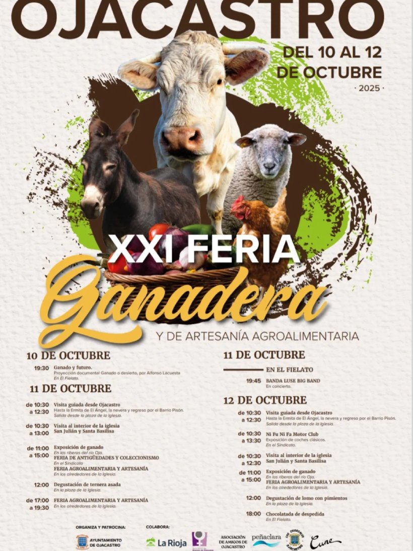 Ojacastro se prepara para celebrar el próximo fin de semana, sábado 11 y domingo 12 de octubre, la XXI Feria Ganadera y de Artesanía Agroalimentaria. Es una oportunidad donde compradores y vendedores de ganado se encuentran, atrayendo a un buen número de visitantes que acuden fieles cada año.