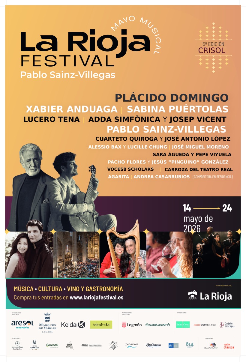 En un acto celebrado en Bodegas Bodegas Marqués de Vargas, el fundador y director artístico del festival, el guitarrista riojano Pablo Sainz-Villegas, ha desgranado la programación de este año, comenzando por el gran hito: la actuación del tenor Plácido Domingo, que protagonizará el concierto central del festival el sábado 23 de mayo en Riojaforum, acompañado por la orquesta ADDA Simfònica bajo la dirección de Josep Vicent. El recital, concebido como una Gala Lírica de Ópera y Zarzuela, reunirá también a artistas invitados de primer nivel: el tenor Xabier Anduaga, la soprano Sabina Puértolas y la legendaria Lucero Tena, icono internacional de las castañuelas. El programa ofrecerá un recorrido por el gran repertorio lírico español e internacional.