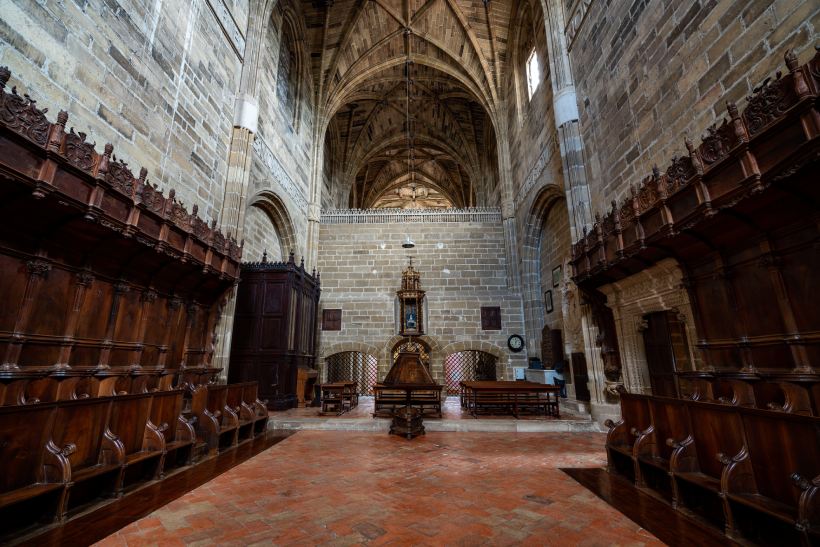 El recorrido comienza en el patio de entrada, continúa con la panorámica exterior del conjunto y después accede a los espacios visitables: sacristía, iglesia, coros, sala capitular y claustro
